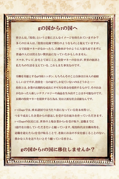 時間と知恵を活かし1億円の資産を築く、本当の資産運用を学び・考え・実行する仲間が集う場所。それがr-village(アールビレッジ)です。